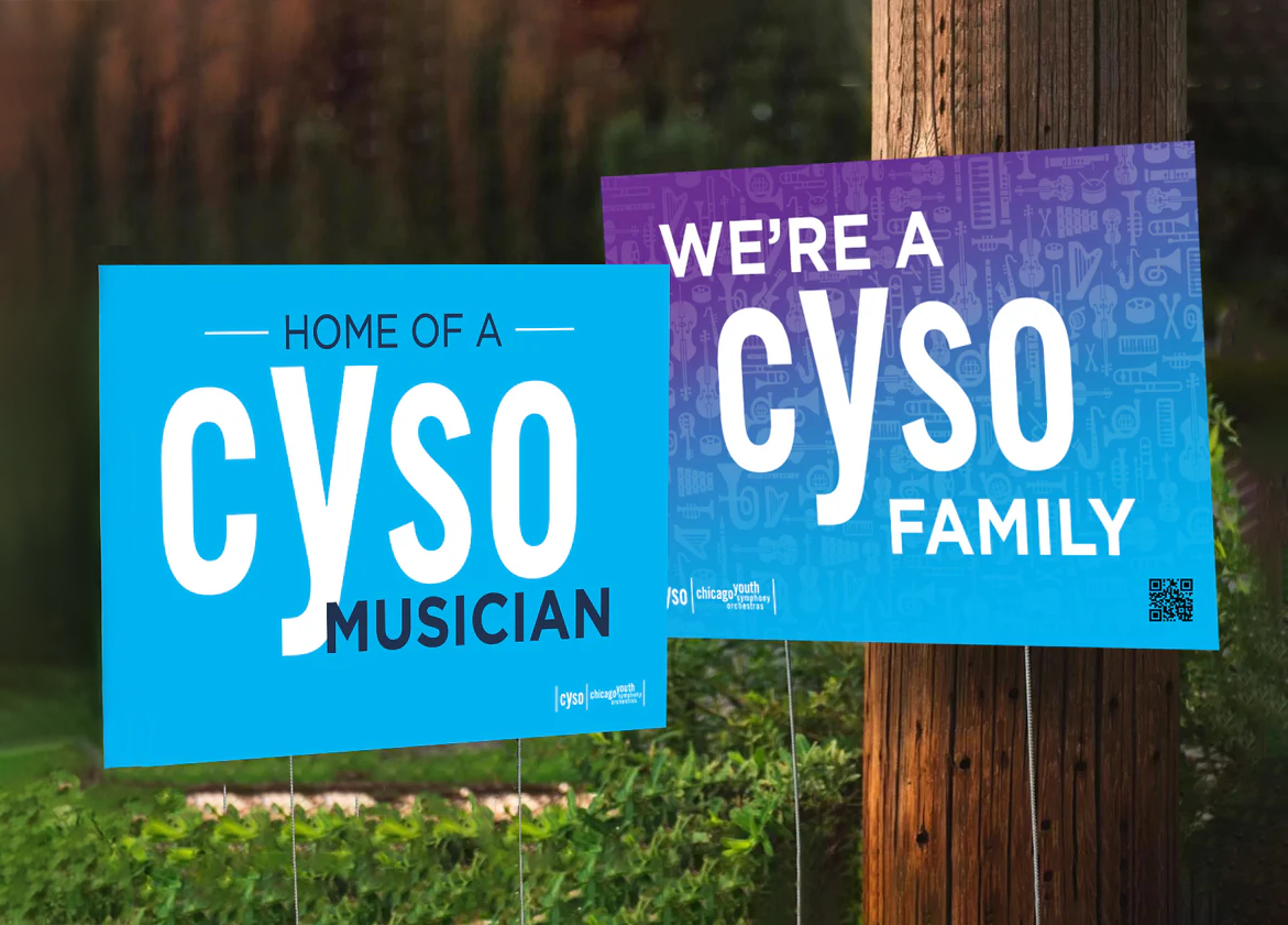 As Director of Marketing for Chicago Youth Symphony Orchestras, I had the opportunity to design many different items for both retail and promotional purposes. I designed dozens of products for the CYSO online store, including yard signs, embroidered patches, knit hats, and felt pennants. For events and tabling displays, I created promotional items such standing and table signage, and stickers. One of the most popular items I introduced were one-inch buttons featuring the faces of CYSO conductors that proved very popular with students! In all the products I produced, I prioritized using high-quality products and worked with local and sustainable printers whenever possible.