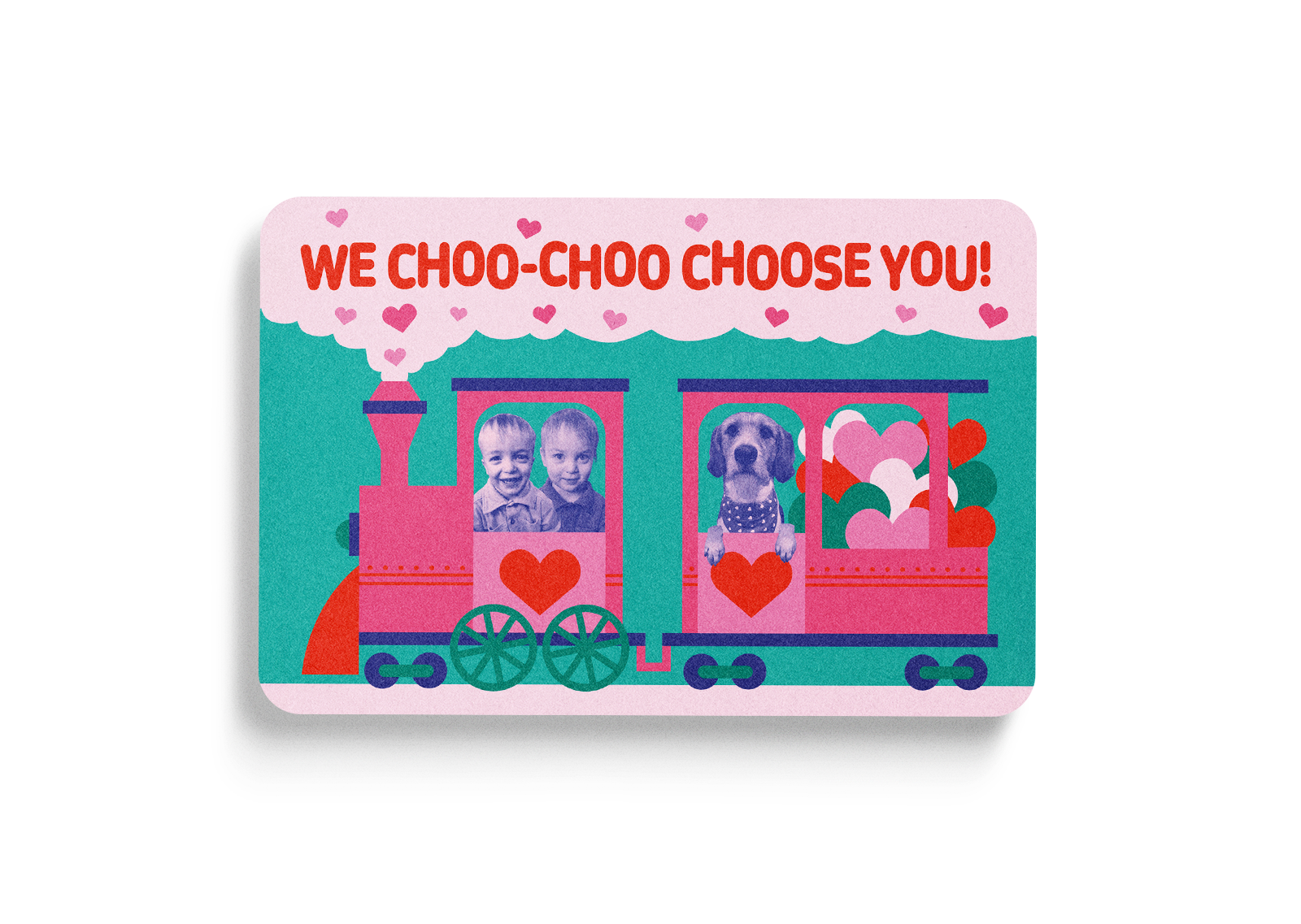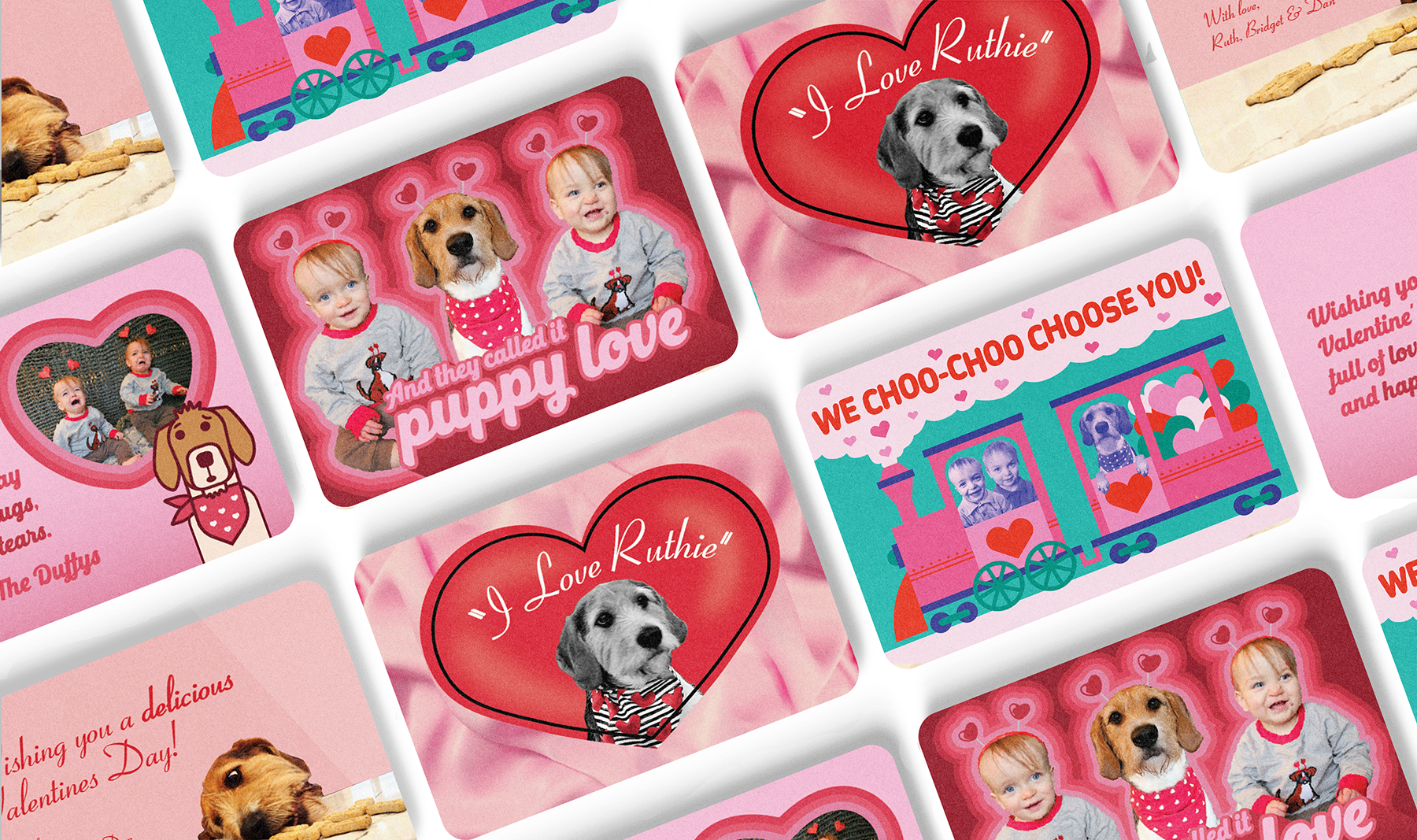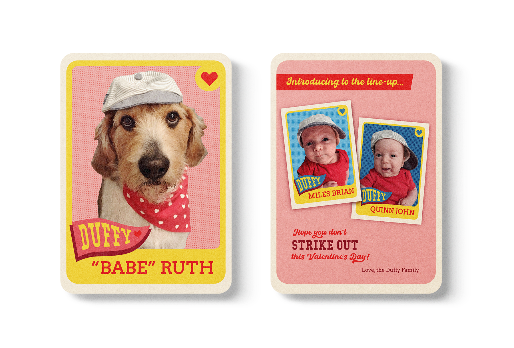 For the past four years, I’ve created custom Valentine’s Day postcard designs for the Duffy family. The project began as a clever replacement for holiday cards that celebrated their dog, Ruth. As the family has grown, the Valentines now include toddler twins Miles and Quinn. Each year’s design has a unique theme that speaks to the Duffy’s year, including an “I Love Lucy” homage, baseball-themed birth announcement, retro 70s vibes, and a celebration of toddler train obsession.