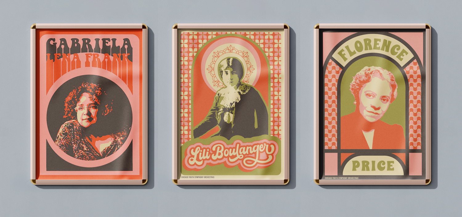 Three of the psychedelic rock poster-inspired designs for composers Gabriela Lena Frank, Lili Boulanger, and Florence Price.